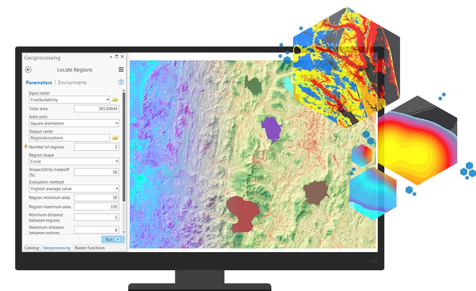 Derive useful insights from your data. Create a hillshade to use as a backdrop of the terrain to support other data layers. Calculate slope, aspect, and contours, or create a map displaying visibility.